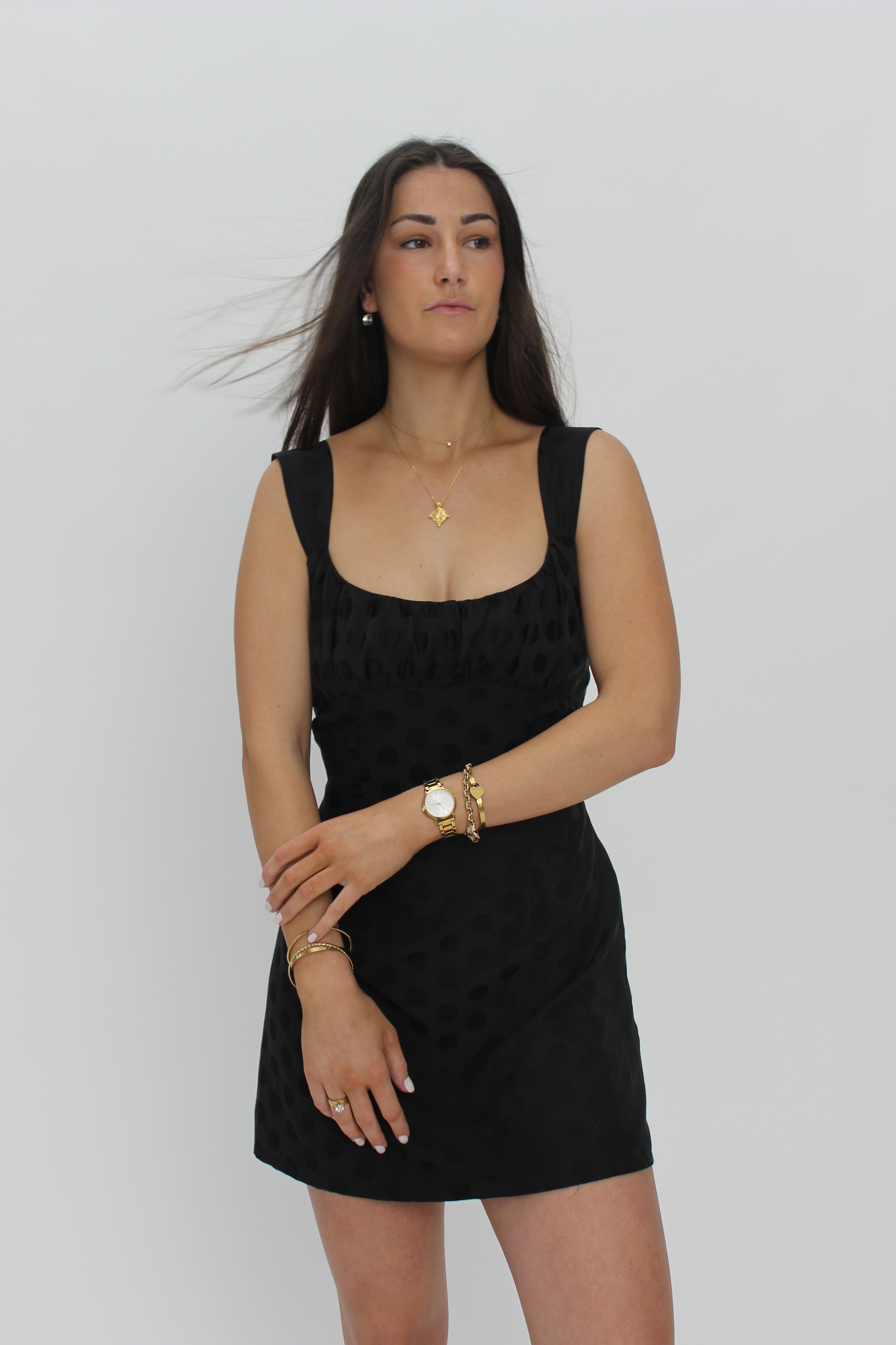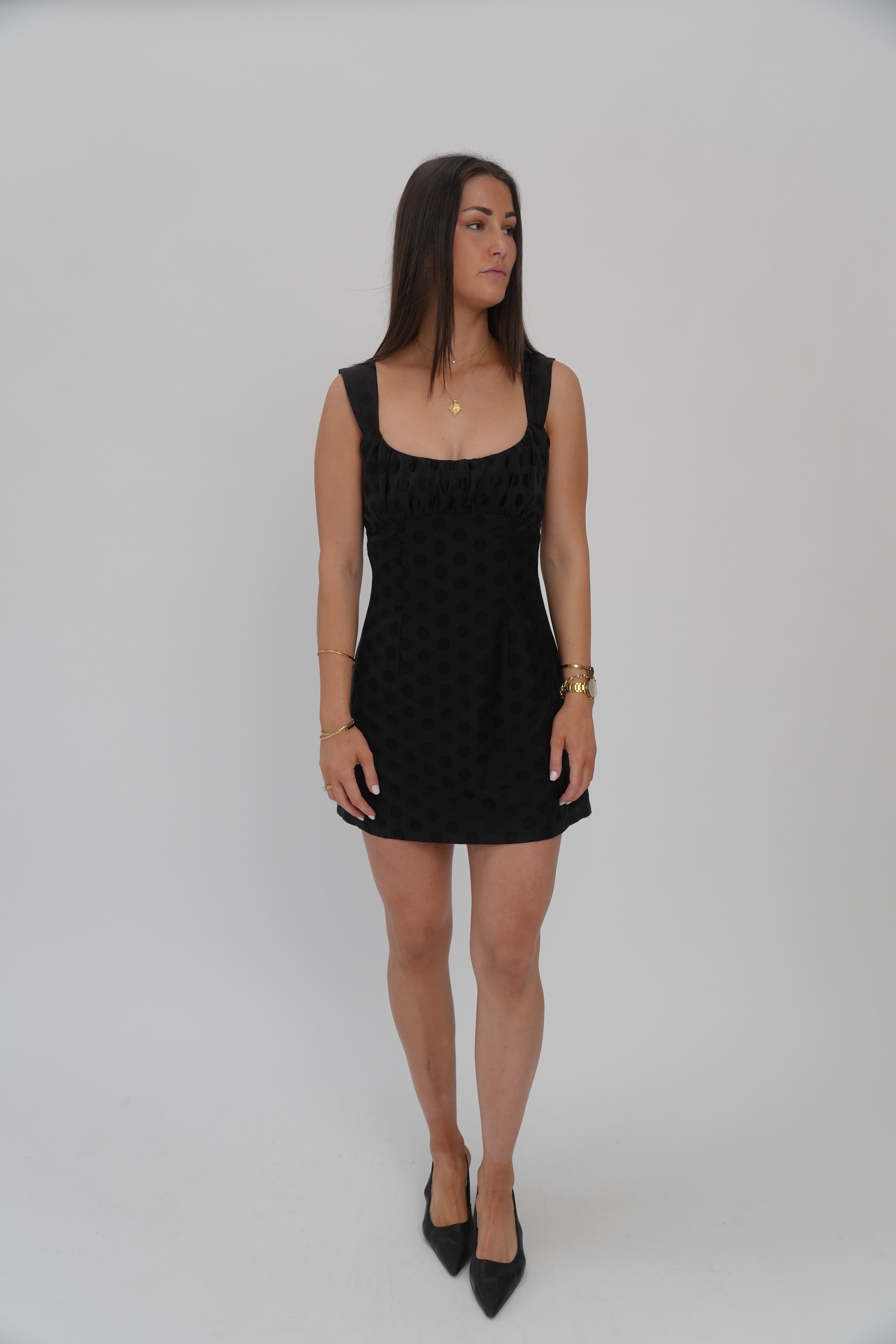 This Amelie Dress is the ultimate combination of luxury and style. Made from a polka dot silk blend, it offers a perfect black mini look that is both elegant and versatile. Look effortlessly chic in this must-have dress.